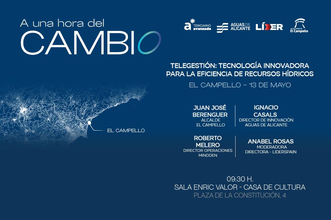 La primera de las jornadas tendrá lugar el próximo martes, día 13 de mayo, en la Sala Enric Valor de la Casa de Cultura de El Campello, ubicada en la Plaza de la Constitución 4, bajo el título, ‘Telegestión: tecnología innovadora para la eficiencia de los recursos hídricos’. Participarán en esta primera cita: Juan José Berenguer, alcalde de El Campello, Ignacio Casals, Director de Innovación de Aguas de Alicante y Roberto Melero, Director de Operaciones de Mindden, actuando como moderadora Anabel Rosas, Directora de Líder y realizando la presentación previa del ciclo de Jornadas, Mariano Torres, presidente del Terciario Avanzado.